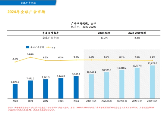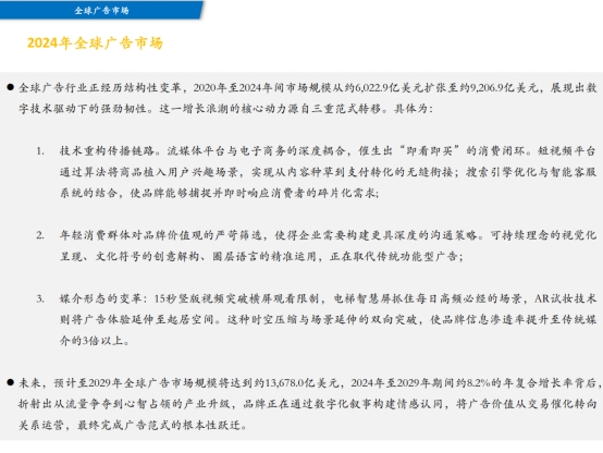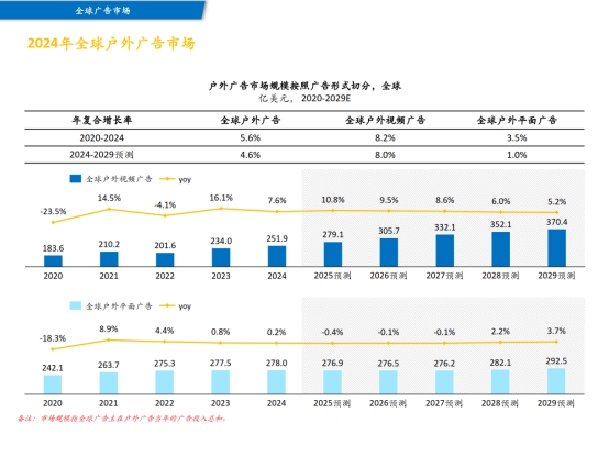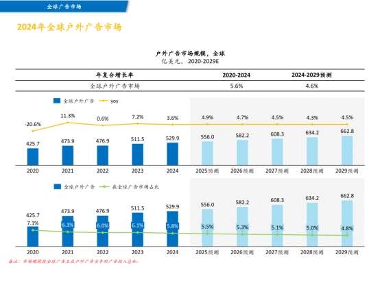 中国广告协会联合权威机构打造的“2024年全球及中国户外广告市场报告”,报告显示,全球广告市场在 2020 - 2024 年规模从约 6,022.9 亿美元扩张至约 9,206.9 亿美元,预计 2029 年将达约 13,678.0 亿美元,技术变革、年轻消费群体需求变化和媒介形态革新是主要推动力。全球户外广告行业规模 2024 年回升至约 529.9 亿美元,其中户外视频广告占比约 47.5%,行业进入智能传播新时代,技术创新提升广告呈现效果和精准触达能力 。