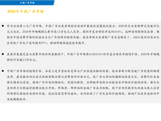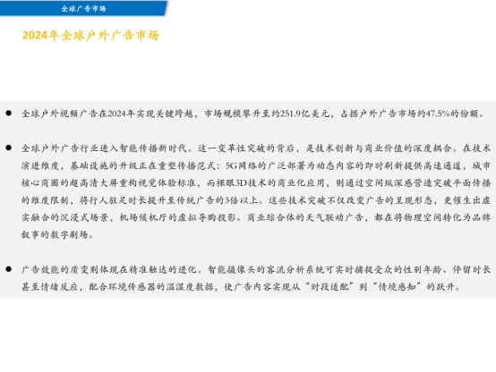 中国广告市场 2024 年规模达 1.5 万亿元人民币,线下广告中户外广告占比约 59.3%,是增长最快的核心力量。中国户外广告凭借空间占有、感官冲击和场景嵌入优势,预计 2029 年市场规模突破约 1,202.0 亿元人民币,其中户外视频广告增长势头强劲,年复合增长率预计约 9.1%。报告认为,无论是全球还是中国,户外广告都在技术赋能和市场需求变化的背景下,展现出巨大的发展潜力,正从传统曝光媒介向品效协同的广告基础设施转变。
