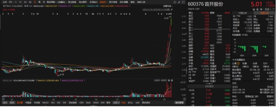 9月11日,首开股份在开盘11分钟后强势涨停,盘中走出7连板行情。截至收盘,首开股份报收于5.01元,上涨7.05%,较7连板前一个交易日即9月2日的收盘价2.64元上涨89.77%,市值达到129亿元。