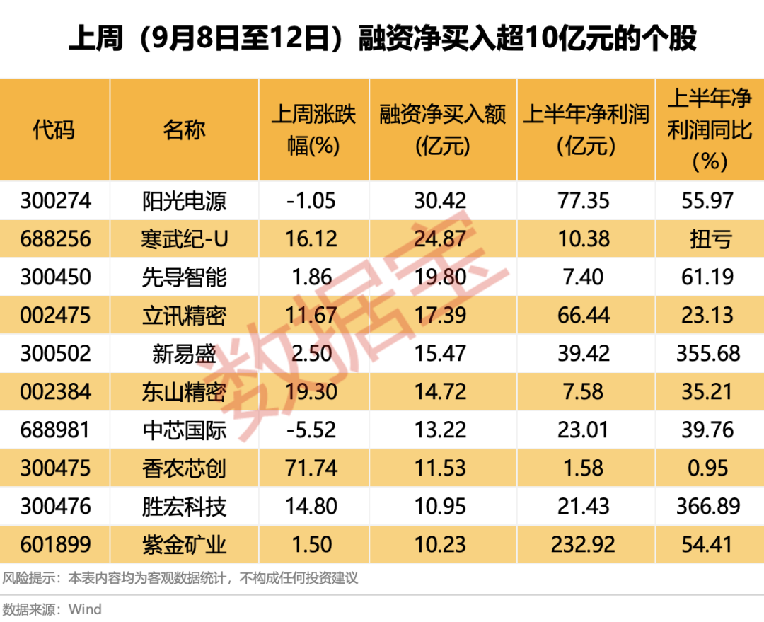 从业绩表现来看,上周获得融资均超10亿元净买入的个股上半年净利润均实现增长,胜宏科技、新易盛的净利润增幅居前,分别同比增长366.89%、355.68%。