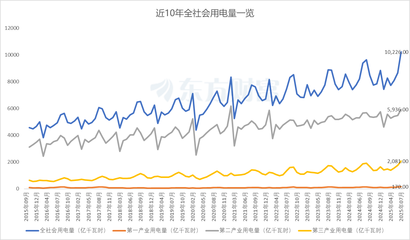 首先,与夏季高温天气直接相关,7-8月,多轮高温过境我国,高温高湿天气来得早、持续久,第三产业和居民空调等用电快速攀升,8月份这两项加起来就接近4000亿千瓦时,占比近四成。