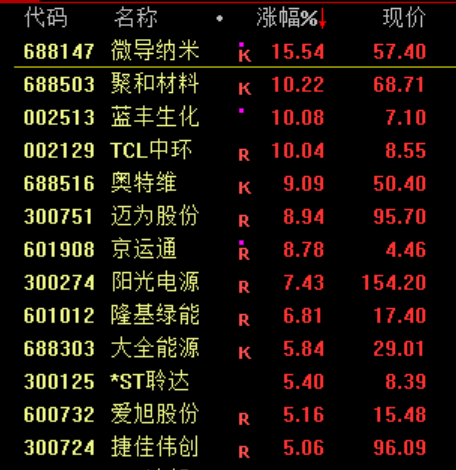 光伏、固态电池等新能源板块拉升,TCL中环、恩捷股份等涨停。