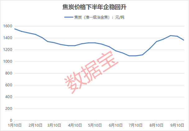 受供需矛盾和焦煤价格下跌影响,上半年焦炭价格明显下跌,下半年以来表现较好。期货价格1—5月连续下跌,累计跌幅达27.78%,6月开始反弹,截至最新报价1716.5元/吨,6月以来累计上涨24.85%。焦炭现货价格自7开始反弹,国家统计局数据显示,9月中旬焦炭(准一级冶金焦)价格为1360.7元/吨,较6月末1096.4元/吨的低点上涨24.11%。