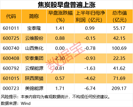 据证券时报·数据宝统计,焦炭板块个股共有7只,早盘普遍上涨,平均涨幅达到1.1%,安泰集团、美锦能源、宝泰隆涨幅居前,分别达到2.3%、1.71%、1.41%。